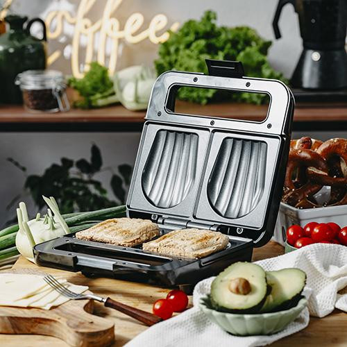 Спеціальна форма нагрівальних пластин у вигляді раковини надає готовим бутербродам привабливого вигляду і рівномірно просмажує інгредієнти з обох боків. Антипригарне покриття полегшує очищення – продукти не прилипають, і пристрій легко мити після використання.