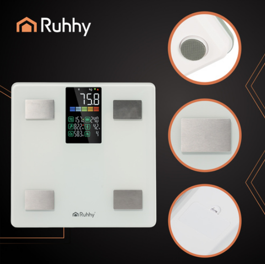 Аналітичні ваги RUHHY — це сучасний пристрій для комплексного контролю вашого здоров’я. Завдяки технології BIA (біоелектричного імпедансу) ваги не лише точно вимірюють масу тіла (до 226 кг), а й аналізують 13 параметрів організму: ІМТ, відсоток жирової тканини, рівень води, м’язову та кісткову масу, вісцеральний жир, білок і метаболічний вік.